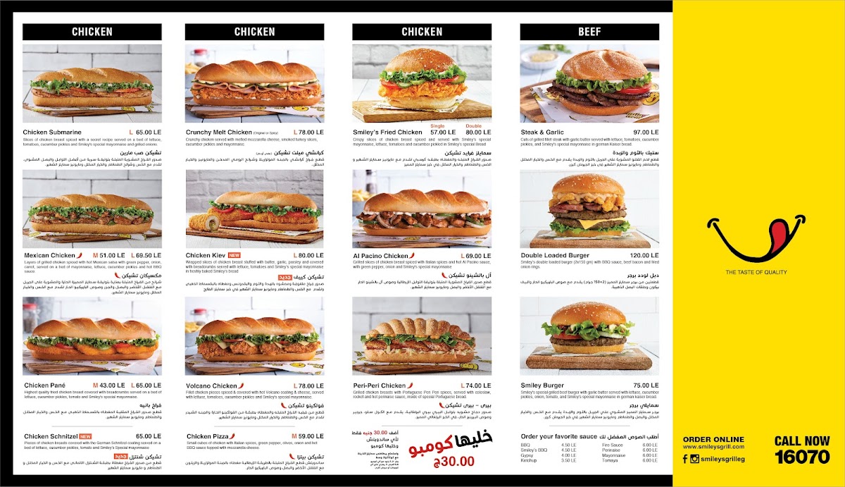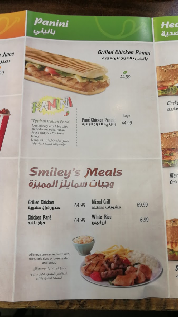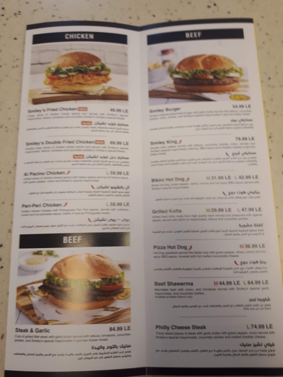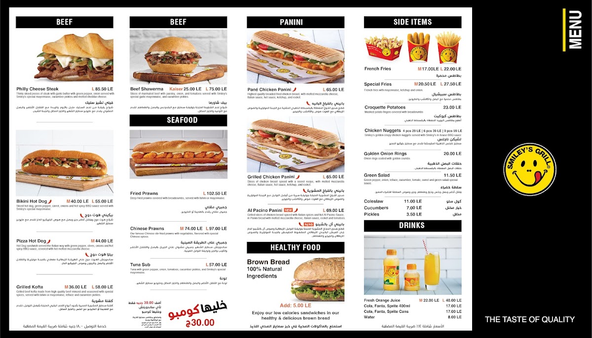 At Smiley’s Grill in Jeddah, Ad Doqi, Dokki, the menu offers a vibrant mix that caters to a variety of tastes. For chicken lovers, highlights include the Chicken Submarine, Smiley’s Crispy Chicken Sandwich, Chick-In Cheese Chinese Chicken, and the Chick N Chilli Bundle, each promising a flavorful bite. Beef options such as the Philly Cheese Steak, Hoisin Beef, and Pizza Hotdog add hearty, satisfying choices. Panini fans can enjoy the Chicken Pane Panini, Al Pacino Panini, and Grilled Chicken Panini, perfectly paired with sides like Onion Rings, Shrimps Spring Rolls, Vegetable Spring Rolls, Croquette Potatoes, and Green Salad. For vegan diners, the Mushroom Fajita offers a well-crafted plant-based option. Families will appreciate the New Kids Meal With A Free Coloring Book Gift, making dining more engaging for little ones. Asian-inspired flavors shine in dishes such as Sweet & Chilli Shrimps, Sweet & Chilli Beef, Sweet & Chilli Chicken, and Chinese Chicken, complemented by a variety of Sauce Cups including Ketchup, Perinaise, Mayonnaise, Cheddar Cheese, and BBQ. Seafood enthusiasts can choose from the Tuna Sub, Fish Strips, Fish Fillet, and Fried Prawns, while beverages like Mineral Water, Sprite Can, V-Cola, and Fresh Orange Juice in both medium and large sizes round out the menu. Overall, Smiley’s Grill presents a diverse, approachable selection that balances classic favorites, international flavors, and kid-friendly options, making it a versatile spot for casual dining.